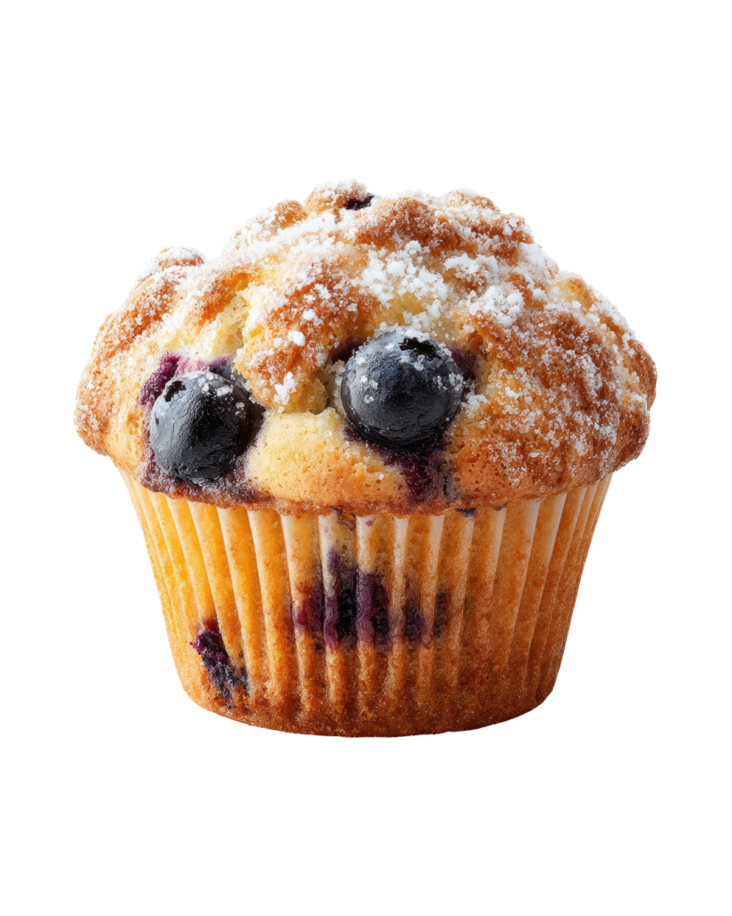 A firm and doughy, vanilla flavored muffin filled with fresh blueberries and topped with sugar crunch bits. A classic dessert with an interesting twist that you cannot go wrong with.